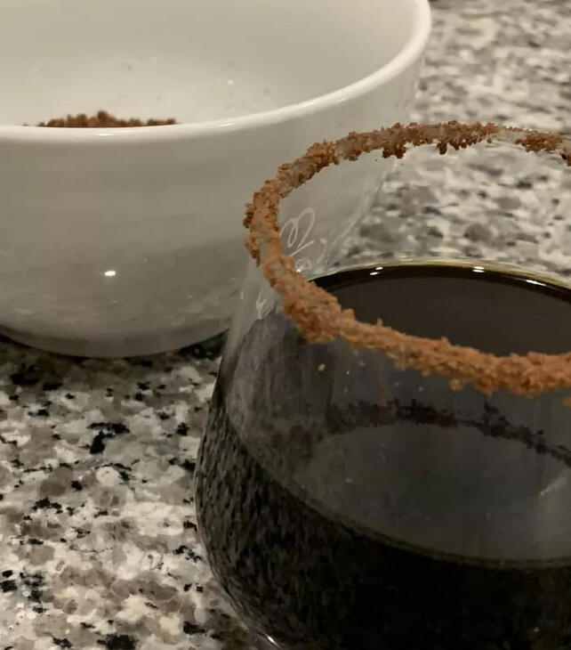 Cold-Brewed Coffee marries Agave Tequila. That then elopes with Dark Coffee Liqueur. Add some Brown Sugar Simple Syrup, shake it up, and strain it into a glass rimmed