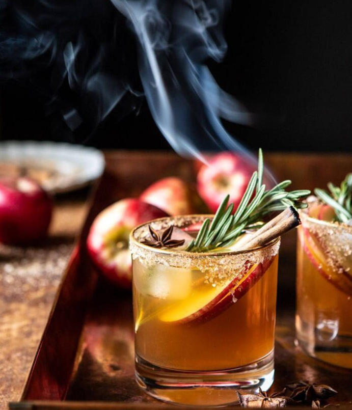 Start with a glass rimmed with salted cinnamon sugar. Now add a splash of Turali Mezcal. Follow that up with some orange liquor, a good amount of spiced cider, a little citrus a la lime, sweeten it up with maple... and strain the resulting mixture into a glass.